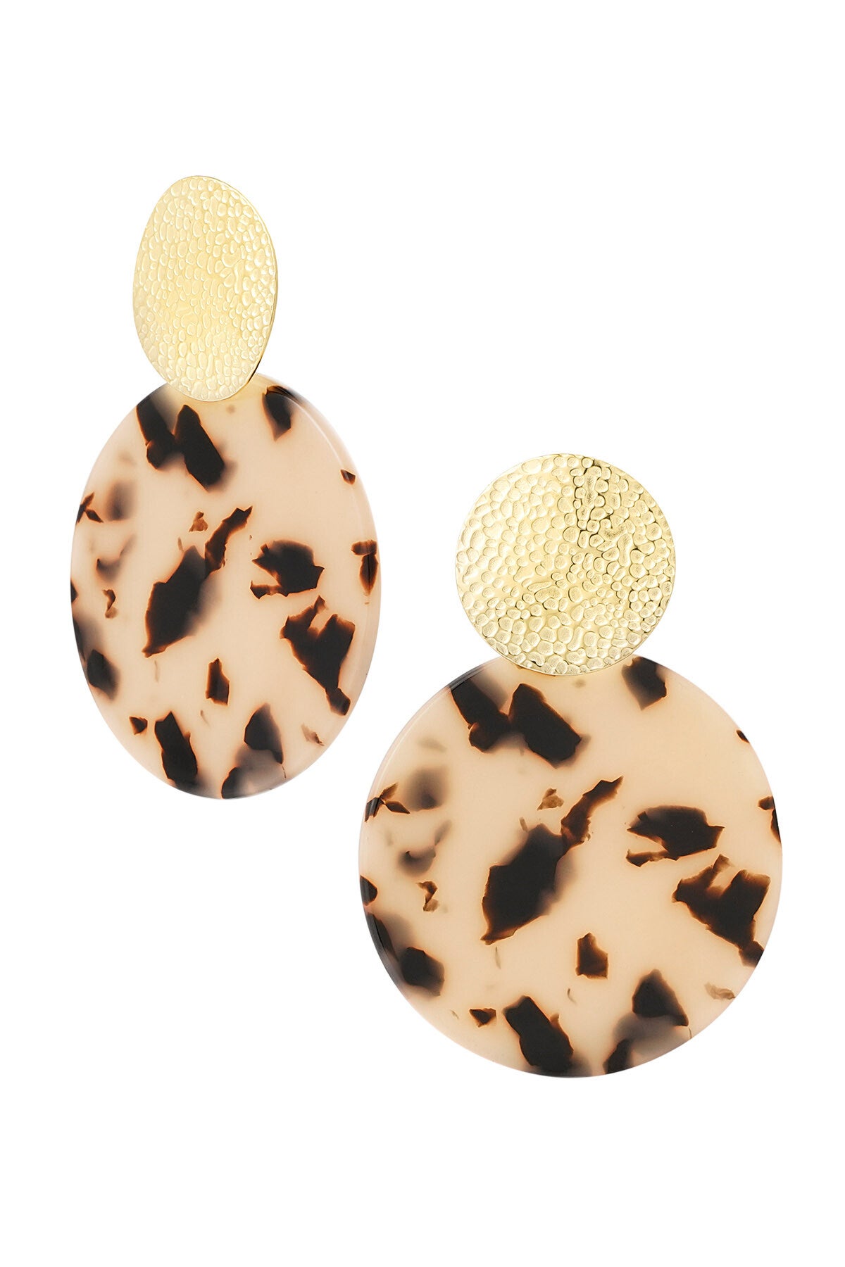 Shop nu deze te gekke gouden statement oorbellen met goud en print detail in de kleur camel.