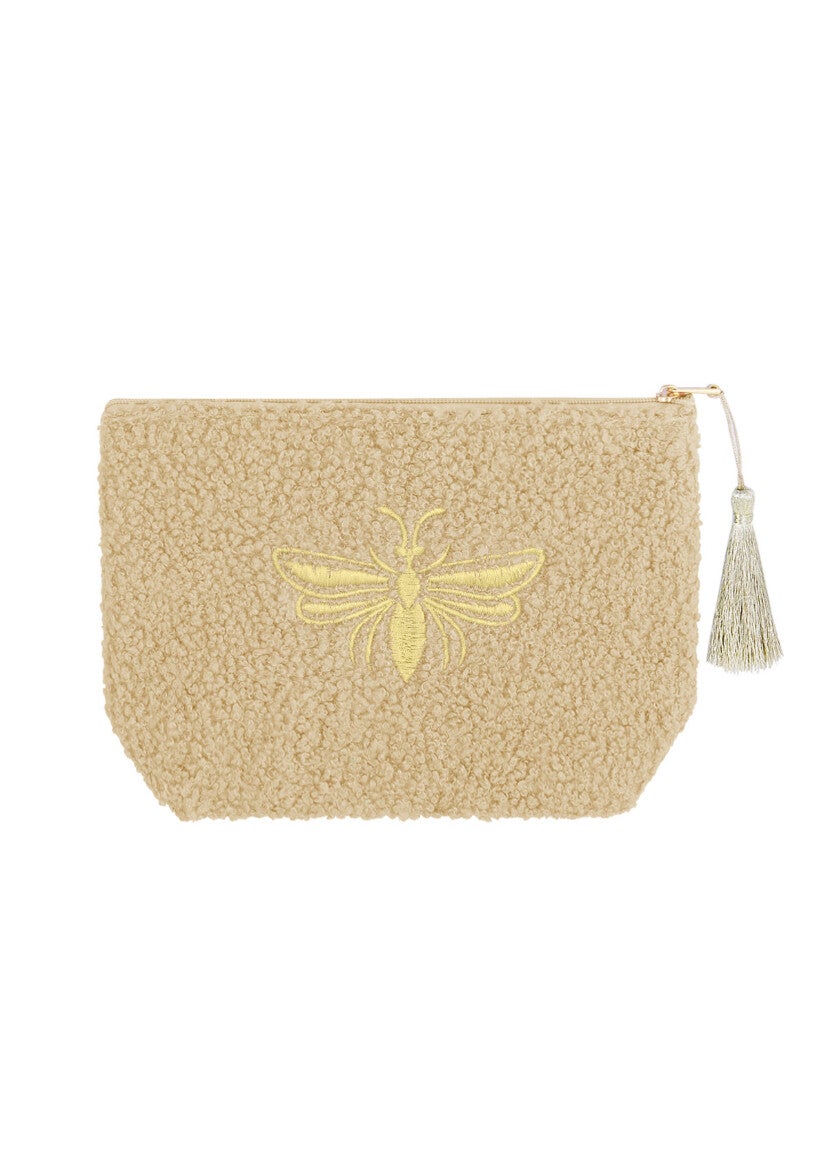 Hoe leuk is dit make-up tasjes met een gouden bij? De tas is gemaakt van polyester en heeft de afmetingen van 19,5 x 13,5 x 5,5 centimeter.