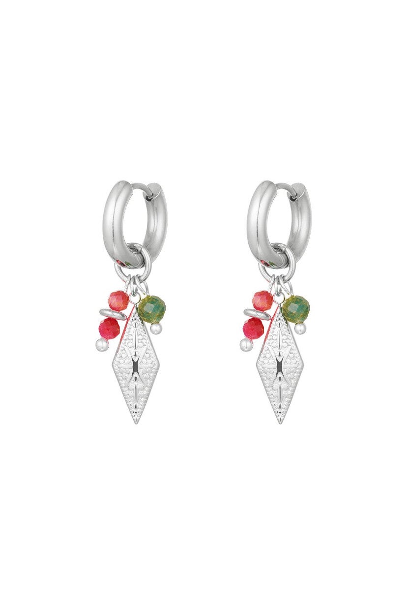 Toffe oorbellen met een ruit bedeltje en kralen in de kleuren wit en oranje. De oorbellen zijn van stainless steel in combinatie met stenen en hematiet. Deze oorbellen zijn super leuk te combineren met meerdere oorbellen voor een echte oorbelparty!