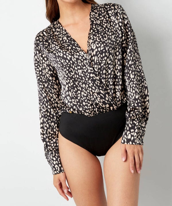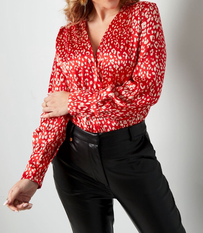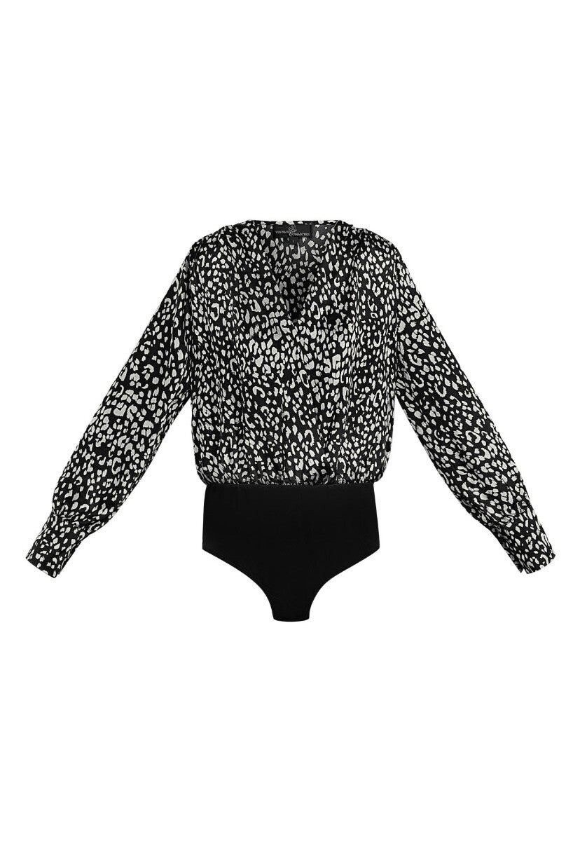 Hoe leuk is deze body met panterprint? Deze body heeft een V-hals wat de blouse heel elegant maakt. De body is gemaakt van 100% polyester.