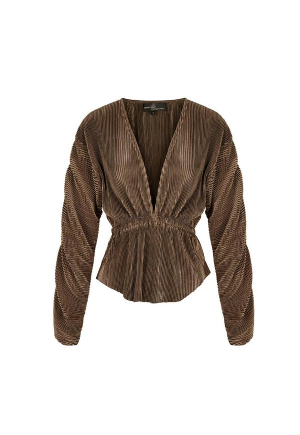 Trend alert!! Hoe leuk is deze blouse met rib structuur en prachtige geplooide mouwen! Dankzij de prachtige mouwen, valt de blouse erg mooi en speels. De blouse is voorzien van een V-hals en heeft een elastieken band in de taille, waardoor de blouse mooi valt. Leuk om deze blouse te combineren met een blazer en jeans voor een casual look. Heb jij een feestje gepland? Draag dan deze blouse in combinatie met een pantalon of rok!